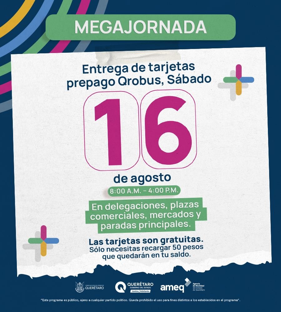 Este 16 de agosto, en un horario de 08:00 a 16:00 horas, la Agencia de Movilidad del Estado de Querétaro (AMEQ) realizará una nueva megajornada de entrega de tarjetas de prepago, las cuales las y los ciudadanos pueden adquirir de manera gratuita a través de una recarga de 50 pesos para su activación, fortaleciendo así la movilidad en la Zona Metropolitana de la entidad.