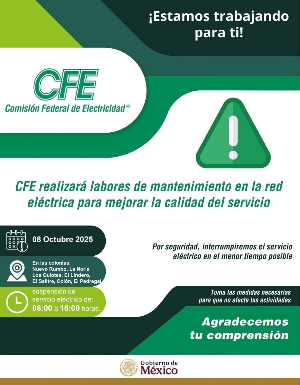 Debido a estos trabajos, se suspenderá el suministro de energía eléctrica de 08:00 a 16:00 horas en la cabecera municipal y en las comunidades Nuevo Rumbo, La Noria, Los Quiotes, El Lindero, El Salitre, Colón y El Pedregal.