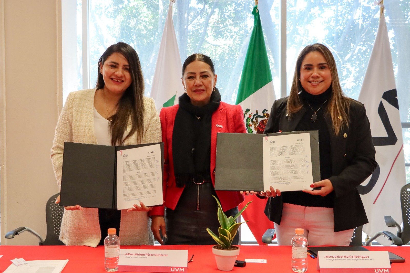 La firma del convenio se realizó en las instalaciones de la Universidad en presencia de las consejeras electorales del Instituto, Violeta Larissa Meza Lavadores y Alma Fabiola Rodríguez Martínez, así como de personal directivo de la UVM Campus Querétaro.