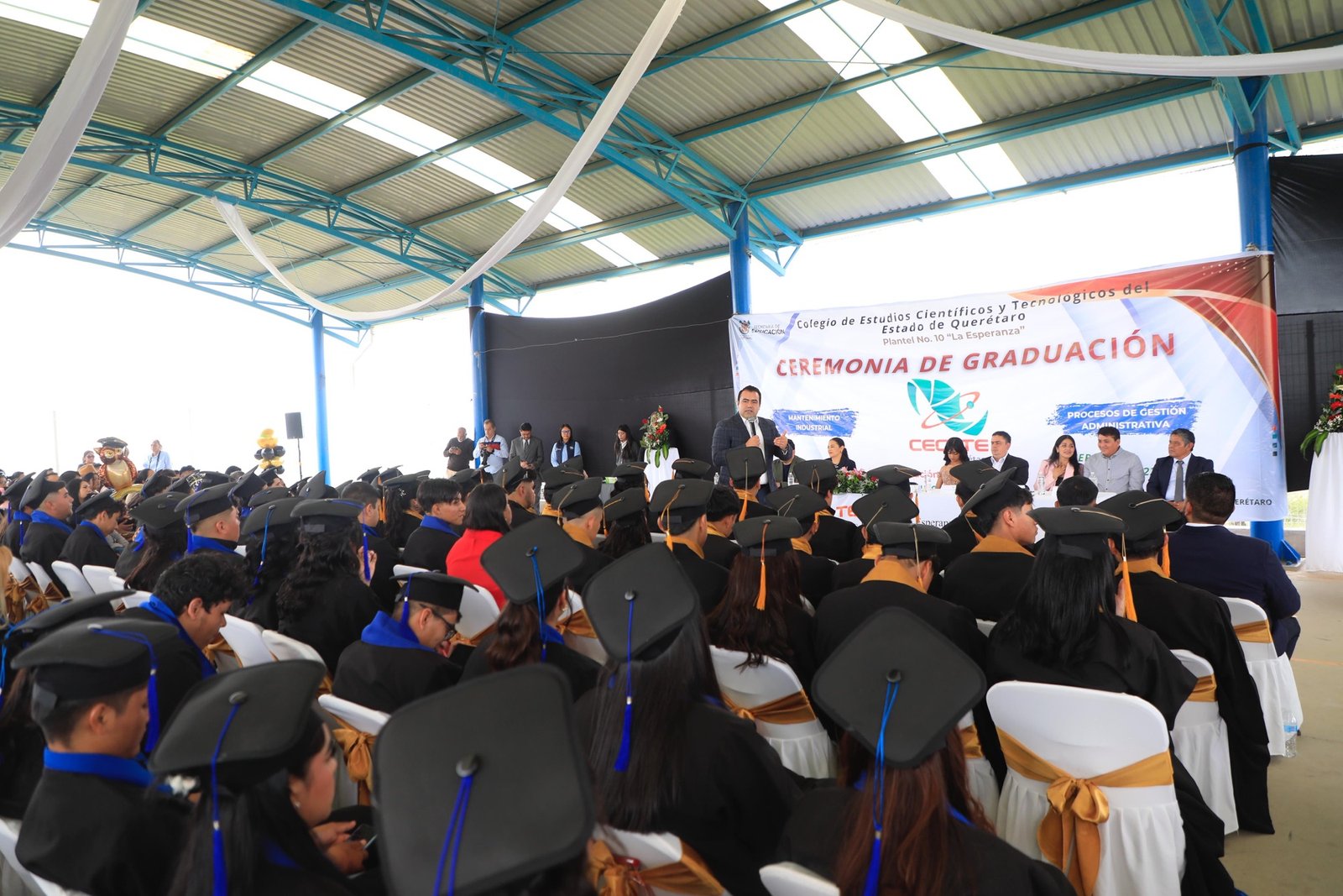 Colón, Qro., 11 de julio de 2025.- El presidente municipal, Gaspar Trueba Moncada, asistió a la ceremonia de clausura de cursos de la Generación 2022-2025 del Colegio de Estudios Científicos y Tecnológicos del Estado de Querétaro (CECyTEQ), Plantel 10 La Esperanza, de donde egresaron 128 alumnos.