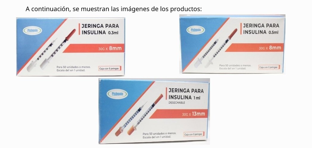 La presente alerta se emite como resultado del análisis documental técnico de las denuncias presentadas y de la comparecencia ante esta autoridad sanitaria. La empresa EMBECTA MÉXICO, S. DE R.L. DE C.V., identificó la comercialización ilegal de la Jeringa para insulina 0.3 mL en tiendas de autoservicio y la empresa NIPRO MEDICAL DE MÉXICO S.A. DE C.V., informó en comparecencia que no tienen ninguna relación con la marca Pishguin la cual está ocupando el registro sanitario 02273C2000 SSA de NIPRO en el empaque de dichos productos, los cuales se enlistan a continuación: