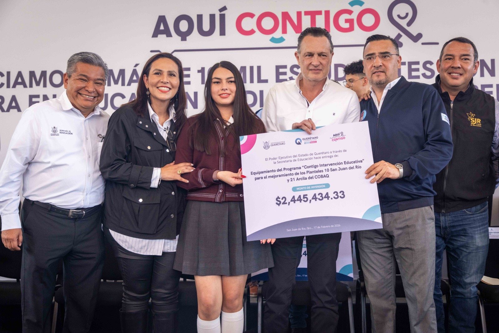 En San Juan del Río y en todo Querétaro tenemos una meta permanente: mejorar la calidad educativa, afirmaron autoridades estatales encabezadas por el gobernador Mauricio Kuri González, durante la entrega de equipamiento del programa “Contigo Intervención Educativa”, e infraestructura para educación media superior y superior en la demarcación.