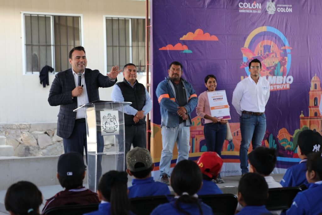 Colón, Qro., 28 de enero de 2026.— En una gira de trabajo por comunidades del municipio, el presidente municipal de Colón, Gaspar Trueba Moncada, encabezó la entrega de adocreto para mejorar la infraestructura de dos escuelas primarias en la comunidad de La Esperanza, así como la inauguración de una obra de urbanización integral en Ajuchitlán, acciones que buscan fortalecer la educación y dignificar los espacios públicos.