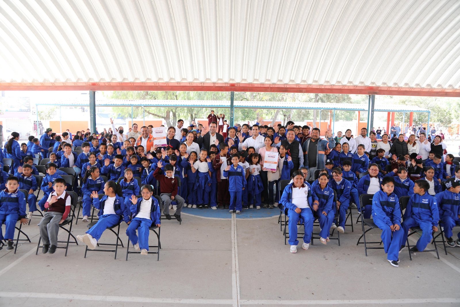 Acompañado por directivos escolares, autoridades auxiliares, funcionarios municipales y regidores, el alcalde entregó el material para las primarias “J. Guadalupe Velázquez” (turno matutino) y “Octavio Paz” (turno vespertino), donde subrayó que invertir en educación es apostar por el futuro del municipio.