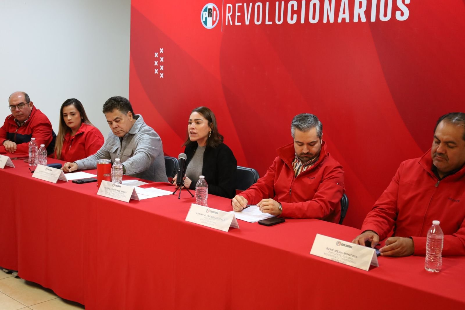 En la rueda de prensa estuvo acompañada por René Mejía Montoya, líder de Movimiento Territorial en el estado, Adrián Alvaradejo, presidente del Comité Municipal del PRI en Corregidora, Pablo Meré, presidente del Instituto Reyes Heroles, Aranza Buerba, secretaria general del Comité Municipal del PRI en Corregidora, Gilberto Pedraza secretario de Operación Política del PRI estatal.