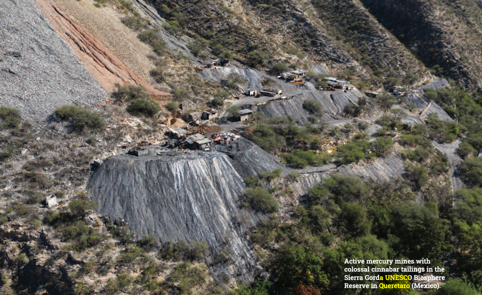 La mayor parte de la producción de mercurio en México ocurre en la Sierra Gorda, donde se localizan al menos 19 minas artesanales activas, muchas dentro de la Reserva de la Biósfera Sierra Gorda. El informe de EIA detalla que el proceso de extracción es rudimentario y altamente contaminante, lo que ha provocado la dispersión de residuos tóxicos en suelos y ríos, con afectaciones directas a comunidades locales.