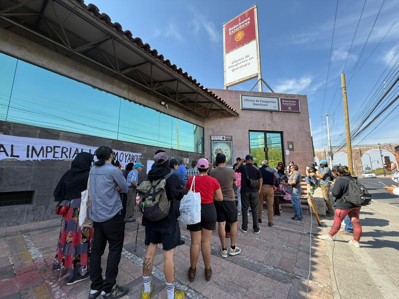 El grupo de poco más de 10 personas que desconocía el motivo de la movilización colocó mantas a las afueras de la oficina de pasaportes de la Secretaría de Relaciones Exteriores, ubicada sobre Bernardo Quintana, donde exigían “no al imperialismo Yanqui”.